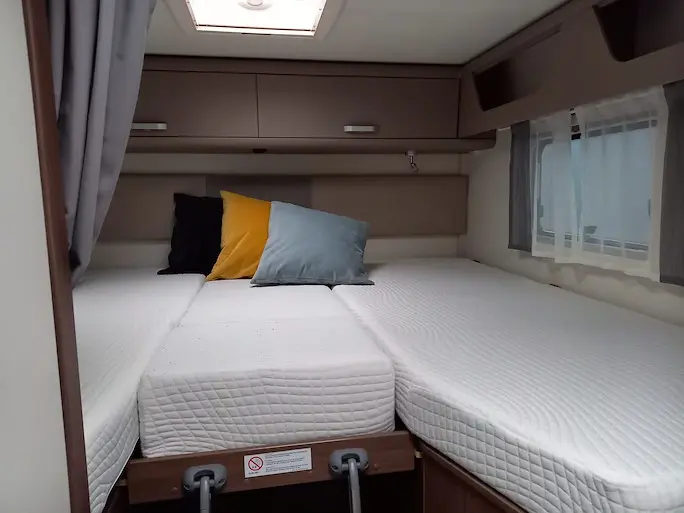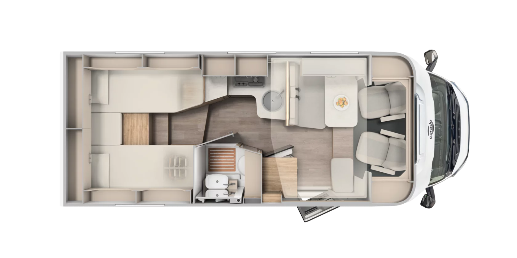 De Carado T338 biedt een slimme en lichte indeling, ideaal voor comfortabel reizen. Dankzij de doordachte indeling is er volop kastruimte: bovenkasten en ruime opbergvakken onder de bedden zorgen voor overzichtelijke opslag van kleding, kookgerei en andere benodigdheden.