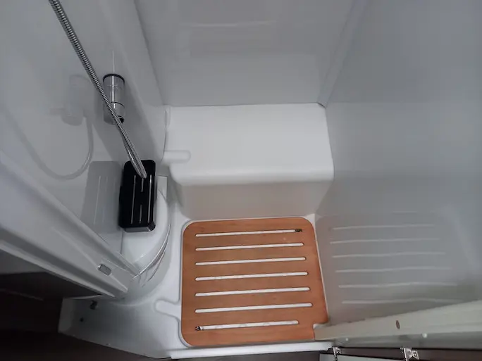 De badkamer van de T338 is compact maar functioneel. Hij beschikt over een toilet, een wastafel en een aparte douchehoek, zodat je ook onderweg comfortabel kunt douchen en jezelf kunt verzorgen.