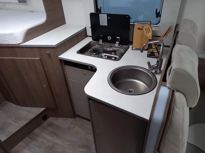 De praktische keuken is voorzien van een 2-pits gasfornuis, spoelbak, koelkast en voldoende werkblad, zodat koken onderweg eenvoudig en comfortabel is. De geïntegreerde watertank is vorstvrij geplaatst en gemakkelijk bereikbaar, waardoor onderhoud en bijvullen probleemloos verlopen.