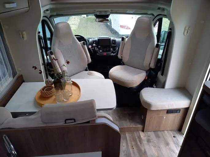 De voorstoelen zijn draaibaar, waardoor een royale en gezellige zithoek ontstaat. Zo kun je met 4 personen comfortabel zitten en genieten van een maaltijd of spelletje onderweg.