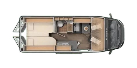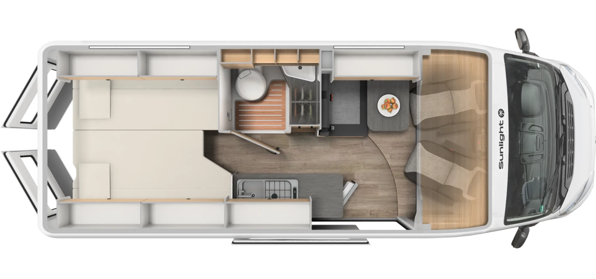 CampersDeze luxe 2-persoons Sunlight Cliff 640 buscamper (met optie voor een derde slaapplaats igeschikt voor een kleiner persoon) is perfect voor een comfortabele reis. Achterin vind je een groot tweepersoonsbed waarvan ook twee enkele bedden te maken zijn. Van de zithoek is eenvoudig een derde slaapplaats te maken, ideaal voor een kind.