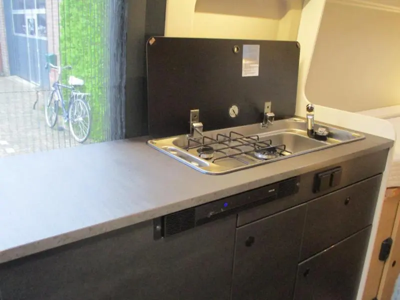 In het midden van de camper de natte ruimte met douche en toilet. In het midden ook de moderne keuken, compleet met tweepits kooktoestel, koelkast met ruime vriezer, wasbak met kraan. De keuken is compleet uitgerust pannen, potten, bestek, borden, kopjes en glaswerk voor 4 personen.