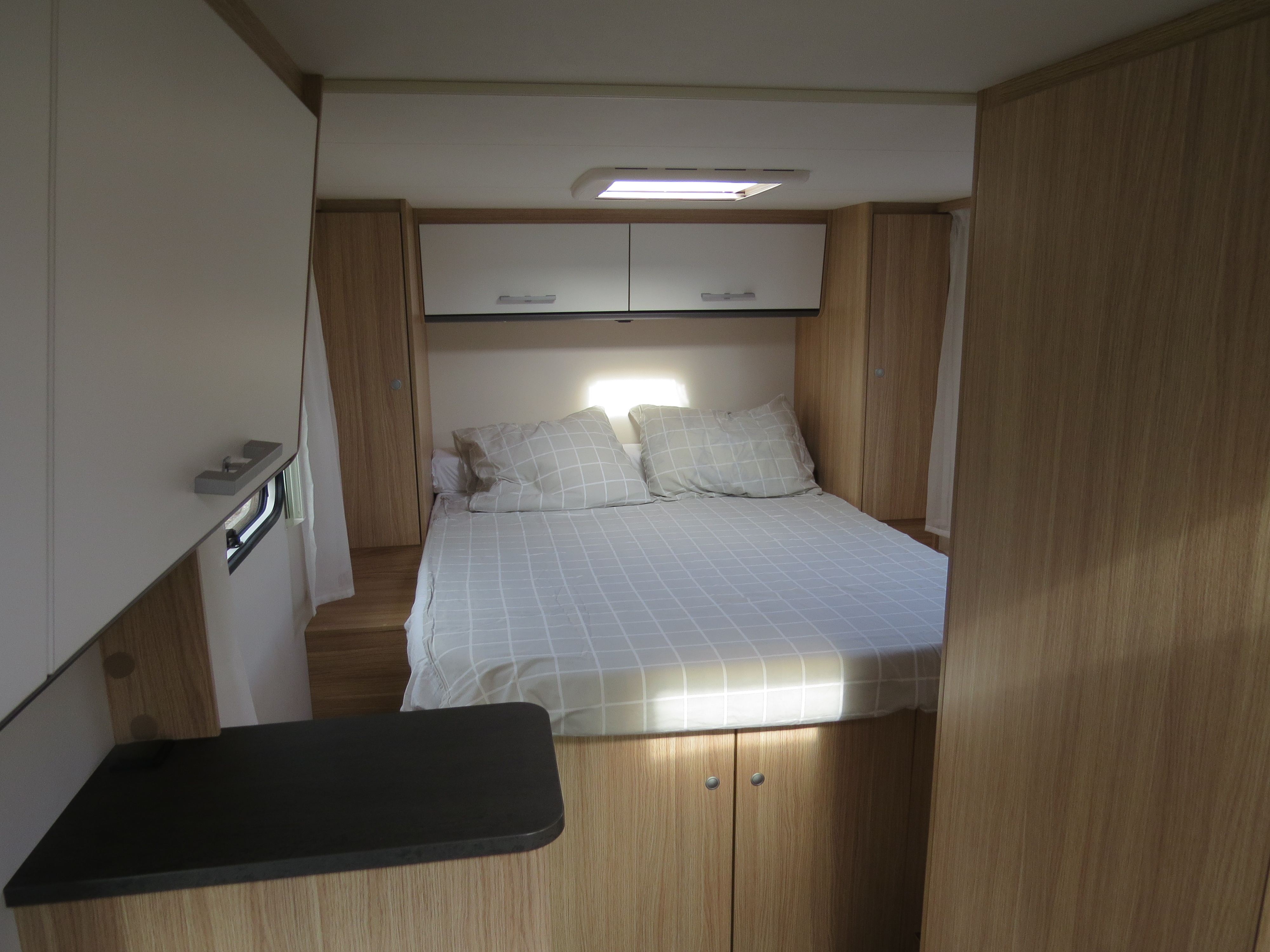 Achterin bevindt zich een vast zgn Queensbed. Dit is een tweepersoons bed met aan beide zijkanten ruimte om in- en uit te stappen.