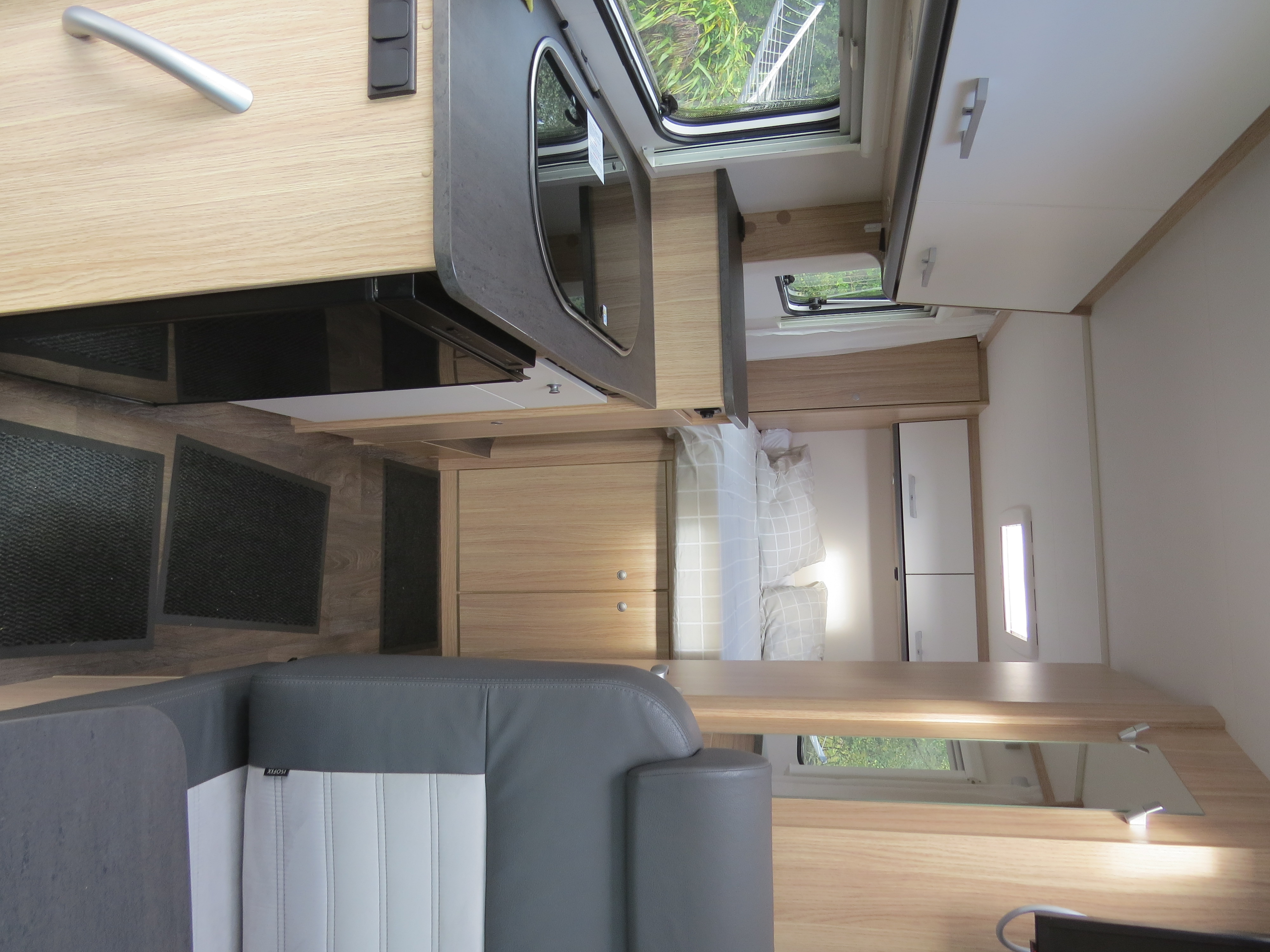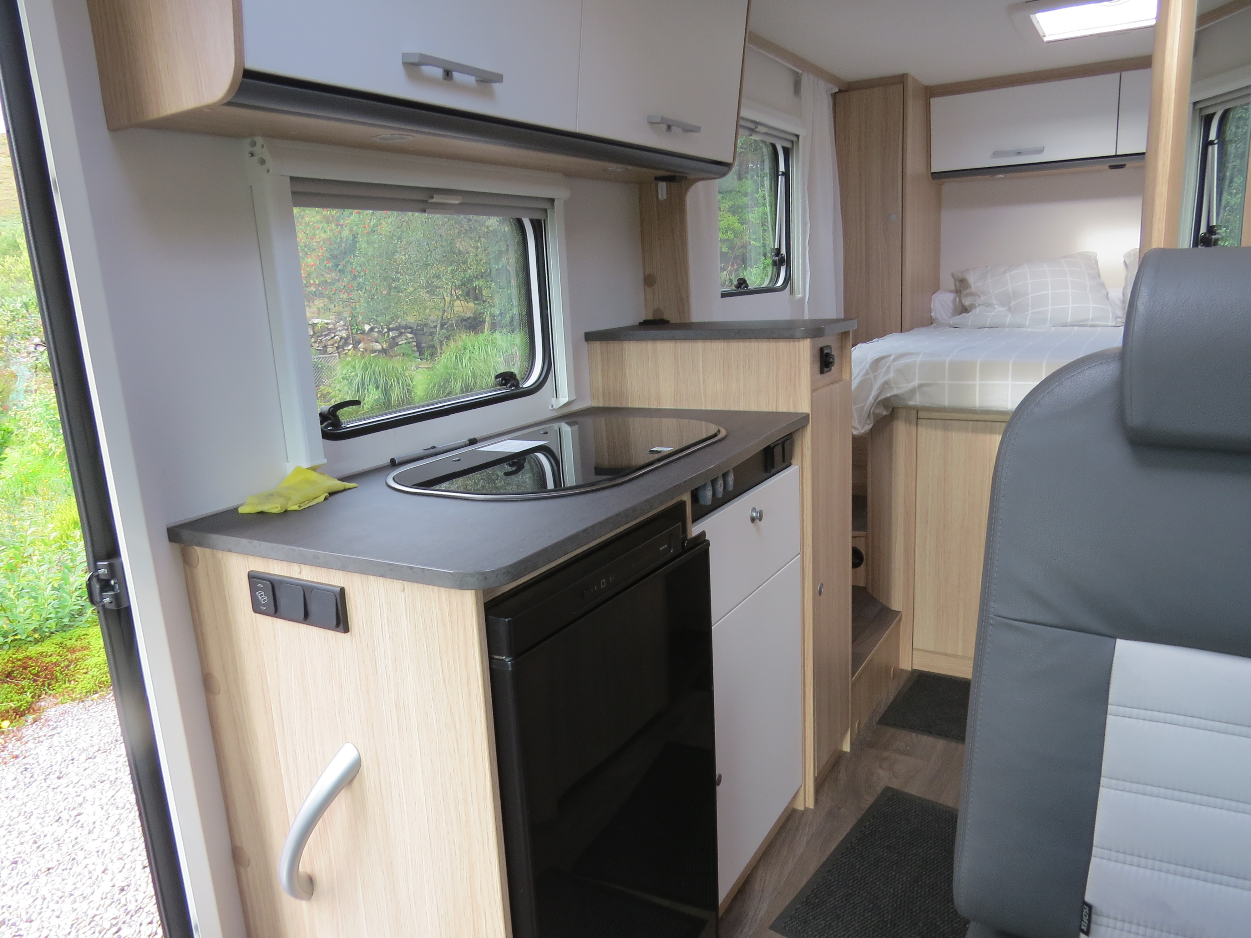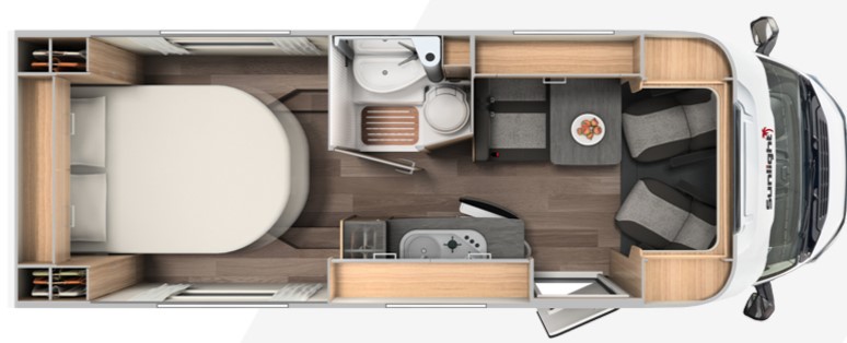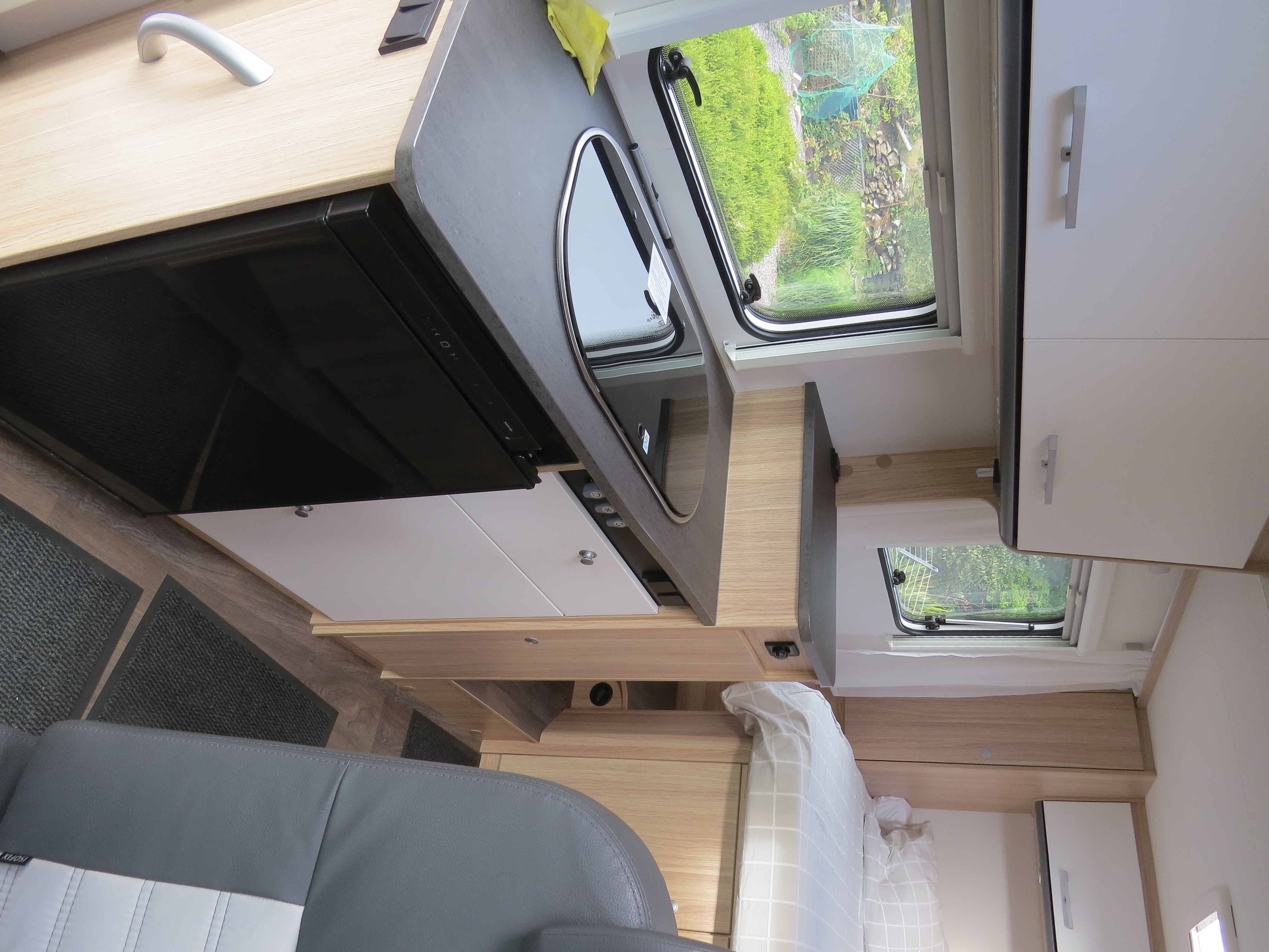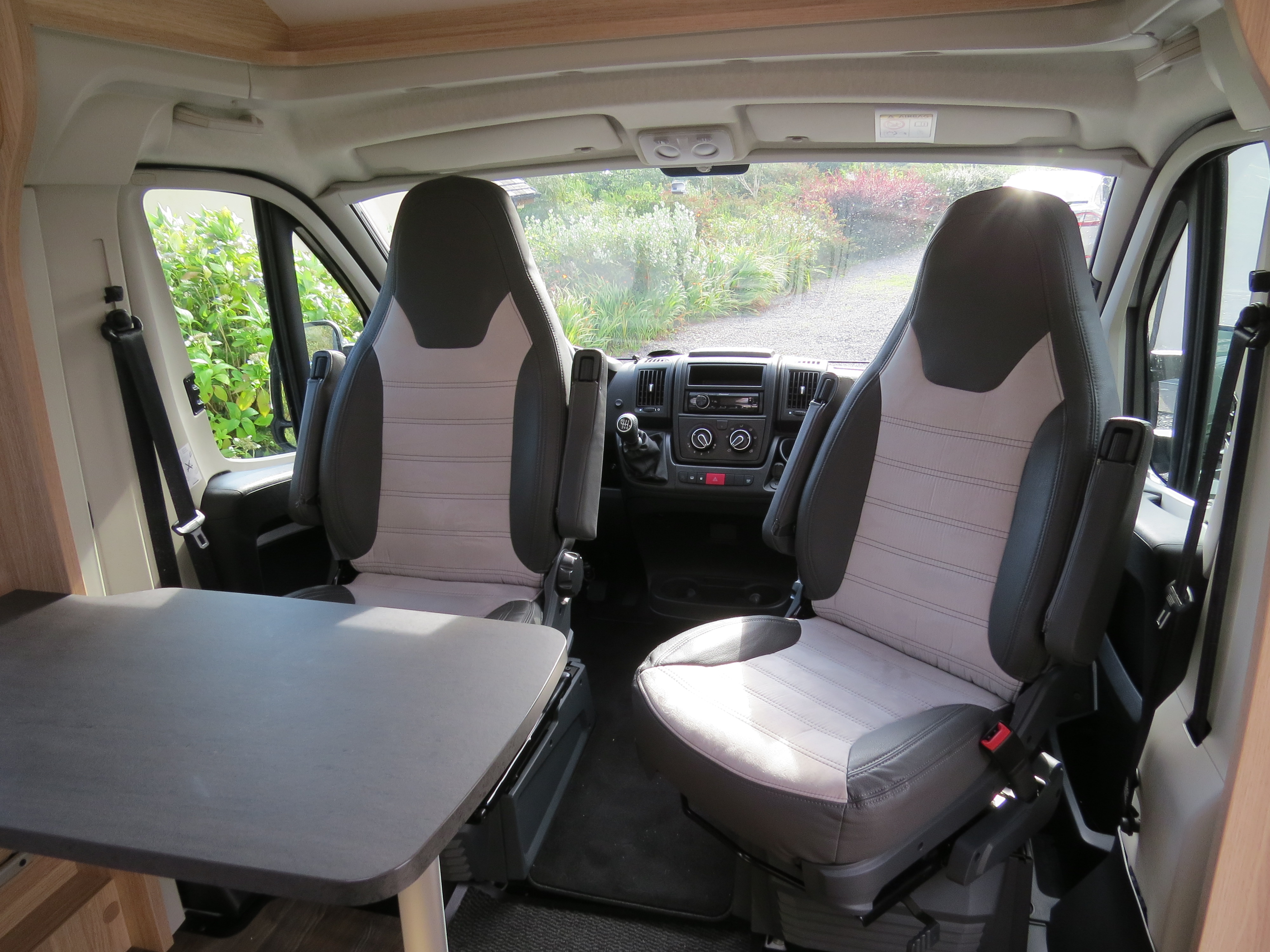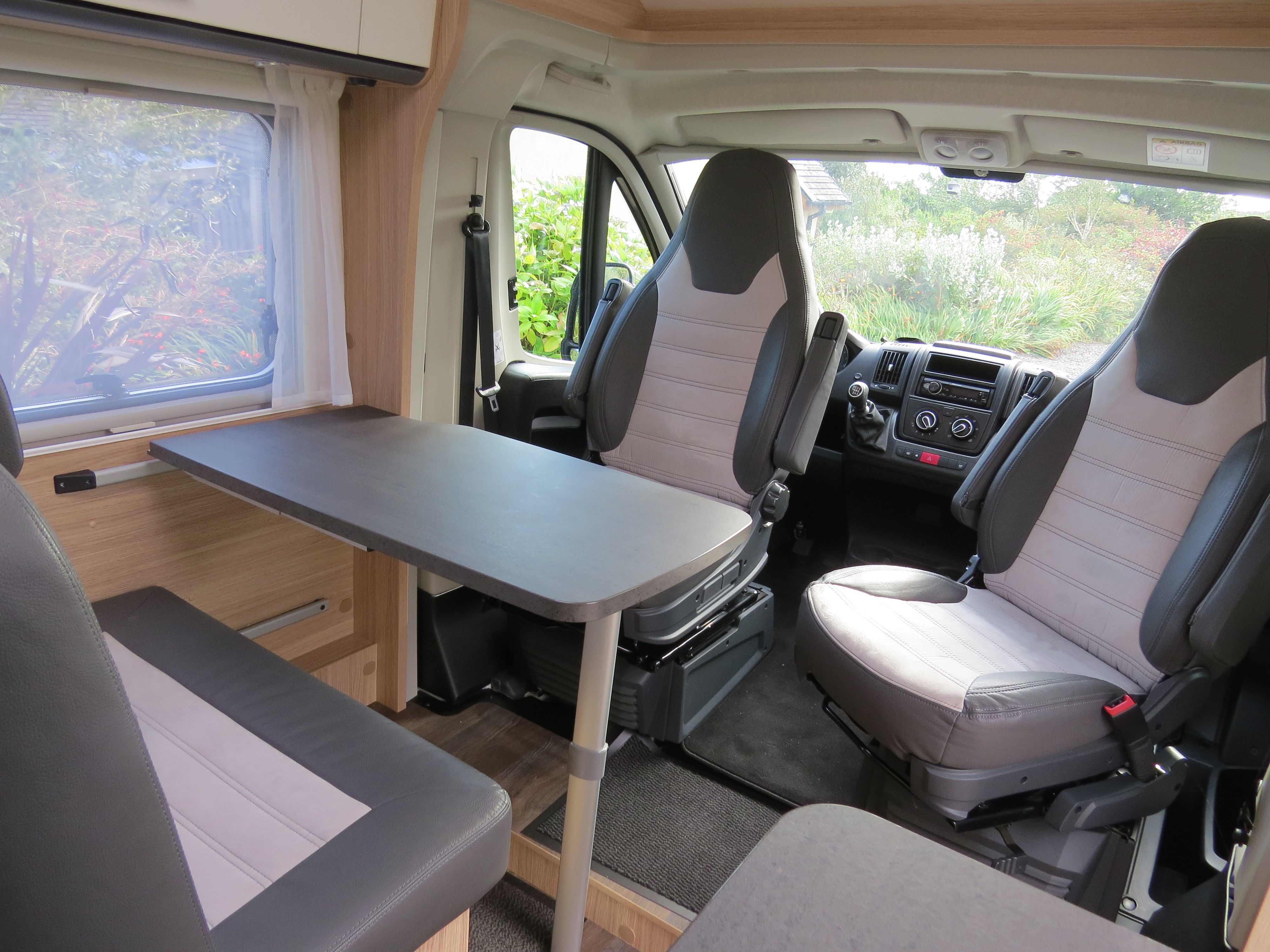 In het midden de natte ruimte en de keuken. En aan de voorzijde, samen met de draaibare voorstoelen een ruime en gezellige zithoek, ideaal om te ontspannen na een dag onderweg.